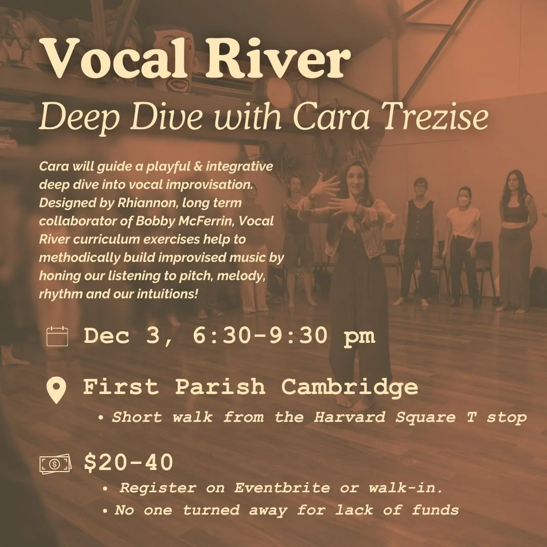 Cara will guide a playful and integrative deep dive into vocal improvisation for community music making. Designed by Rhiannon, lifelong collaborator of Bobby McFerrin, the Vocal River curriculum exercises help to methodically build improvised music by honing our listening to pitch, melody, rhythm and our intuitions! Sign up: